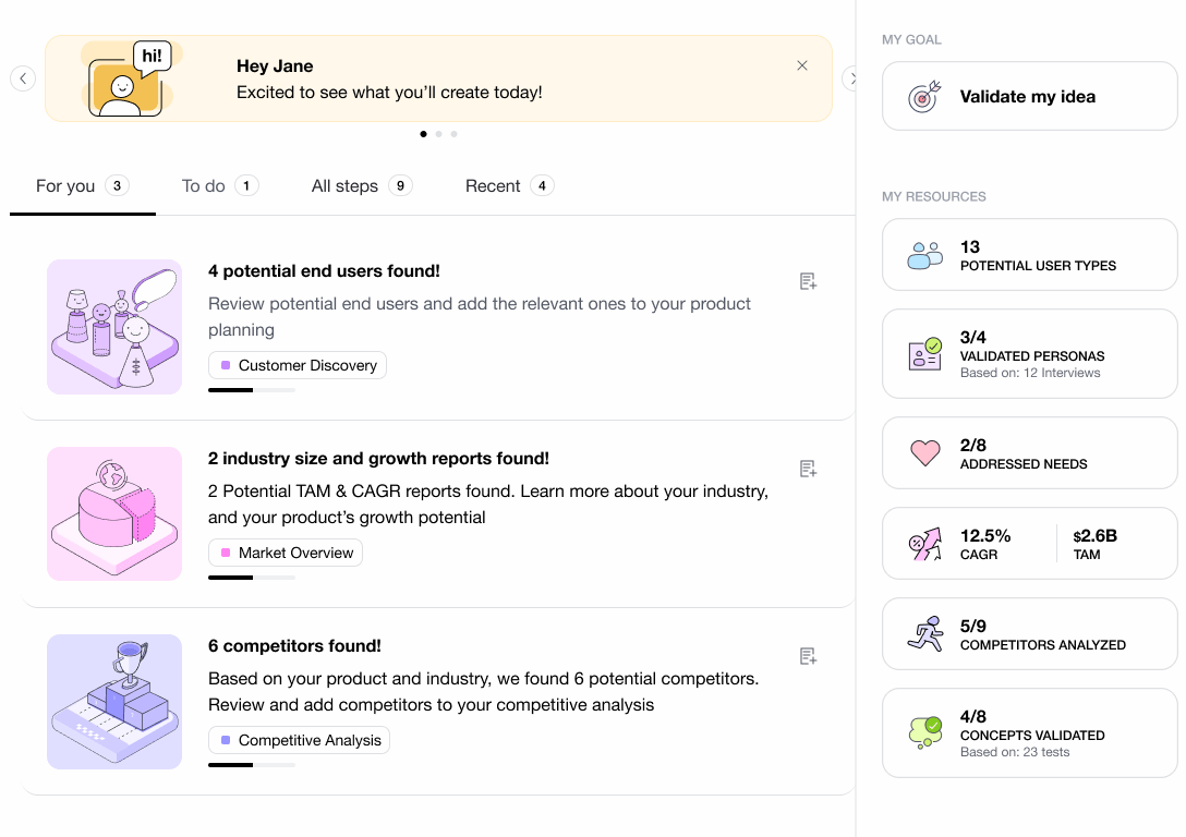Our Idea Validation Overview provides you with a snapshot of how your idea performs in terms of market fit and viability. It gives you insights into strengths and areas for improvement, helping you refine your idea for success.